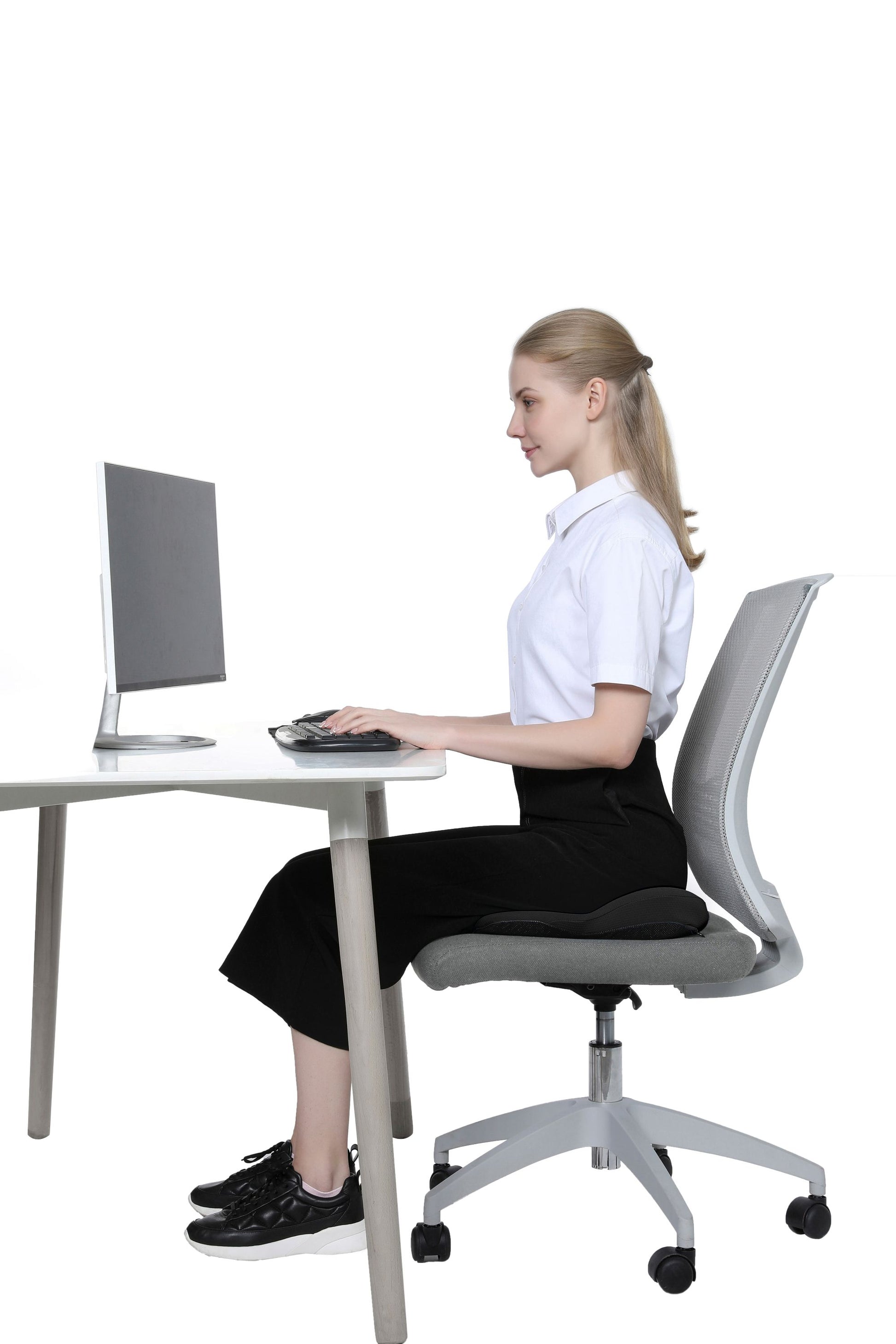 The raised back of the seat cushion allows you to comfortably lean forward slightly while working or driving, allowing you to sit more comfortably.